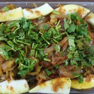 Delight in the crispy and crunchy goodness of this bitter gourd dish, stir-fried with onions, tomatoes, and spices, offering a unique and refreshing flavor profile.